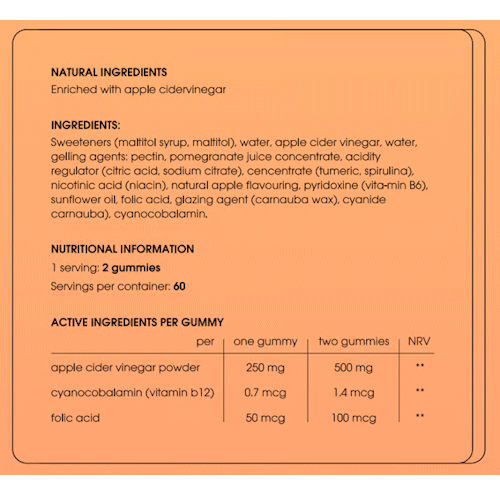 Jede Tagesportion (2 Kaubonbons) liefert laut Produktangaben: Apfelessigpulver 500 mg, Vitamin B12 (Cyanocobalamin) 1,4 µg und Folsäure (Folat) 100 µg. Weitere Bestandteile: Süßungsmittel (Maltitolsirup, Maltitol), Wasser, Apfelessig, Geliermittel Pektin, Granatapfelsaftkonzentrat, Säureregulatoren (Citronensäure, Natriumcitrat), Farb- bzw. Pflanzenkonzentrate (Kurkuma, Spirulina), Nicotinsäure (Niacin), natürliches Apfelaroma, Pyridoxin (Vitamin B6), Sonnenblumenöl, Überzugsmittel (Carnaubawachs). Die Rezeptur setzt damit auf ein fruchtiges Kaubonbon-Format mit Pektin.