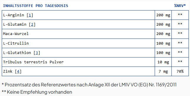 Pro Tagesdosis (2 Kapseln) enthält das Produkt: L-Arginin (200 mg), L-Glutamin (200 mg), Maca-Wurzel (200 mg), L-Citrullin (100 mg), L-Glutathion (100 mg), Tribulus terrestris-Pulver (10 mg) und Zink (7 mg = 70 % NRV). Arginin und Citrullin sind Aminosäuren, die im Körper mit dem Stickstoffmonoxid-Stoffwechsel verknüpft sind; dazu findest du Übersichtsarbeiten auf PubMed (z. B. zu Arginin/NO). Zink ist ein essentielles Spurenelement; zugelassene EU-Claims beziehen sich u. a. auf die Erhaltung eines normalen Testosteronspiegels im Blut sowie normale Fruchtbarkeit und Reproduktion, sofern eine ausreichende Zinkzufuhr vorliegt. Maca ist eine traditionelle Wurzel; Tribulus ein Pflanzenextrakt – beide werden in Nahrungsergänzungen genutzt, wobei die Studienlage je nach Endpunkt heterogen ist. Glutathion ist ein körpereigenes Tripeptid; Glutamin zählt zu den proteinogenen Aminosäuren. Setze die Einnahme in den Kontext ausgewogener Ernährung, Training und Regeneration.